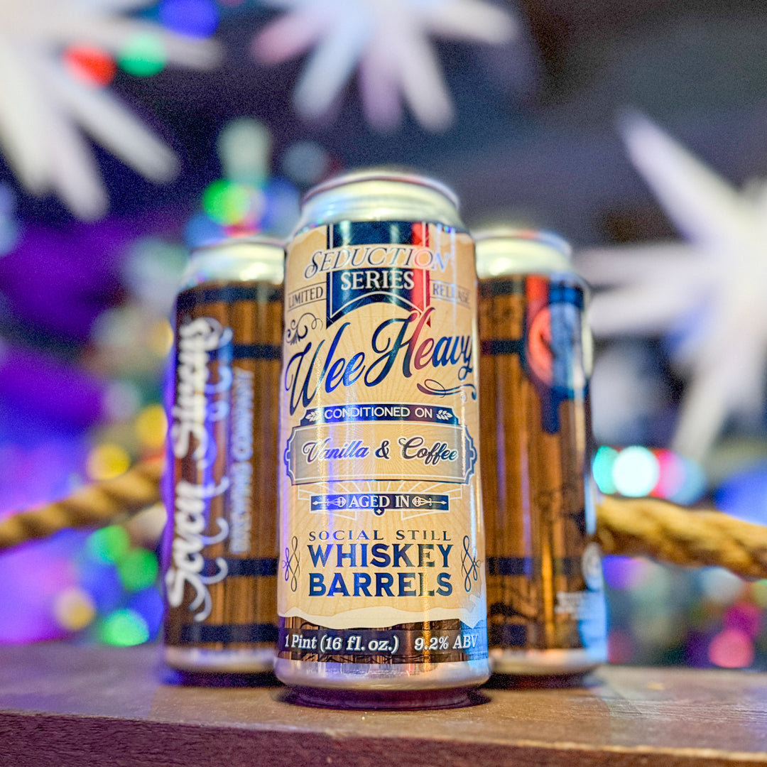 A small-batch, Wee Heavy aged in Social Still Rye Whiskey barrels, developing a bold yet refined character. The rich malt base of caramel and toffee is enhanced by notes of spicy rye, oak, and gentle whiskey warmth. Butterscotch sweetness from the previous batch weaves through each sip, adding a creamy, dessert-like depth and a smooth, warming finish that perfectly balances malt richness and barrel complexity. Our Personal Favorite!